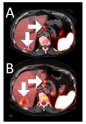 After BriaCell Treatment Image B: Swelling (induration) around the metastasis (lower arrow) demonstrates the liver metastasis has become “hot”, indicating marked CD8+ cytotoxic T cell infiltration while further lymph node enlargement is consistent with increased activity (upper arrow) indicating increased CD8+ T cells.