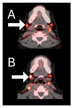 Pre-treatment imaging of cervical (neck) lymph nodes with moderate uptake indicating presence of some CD8+ cytotoxic (“killer”) T cells.